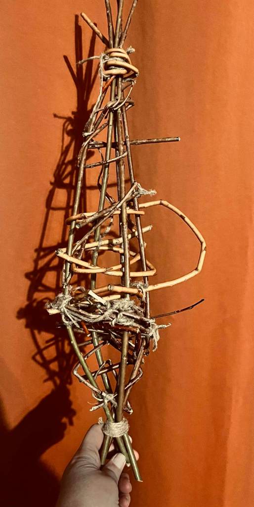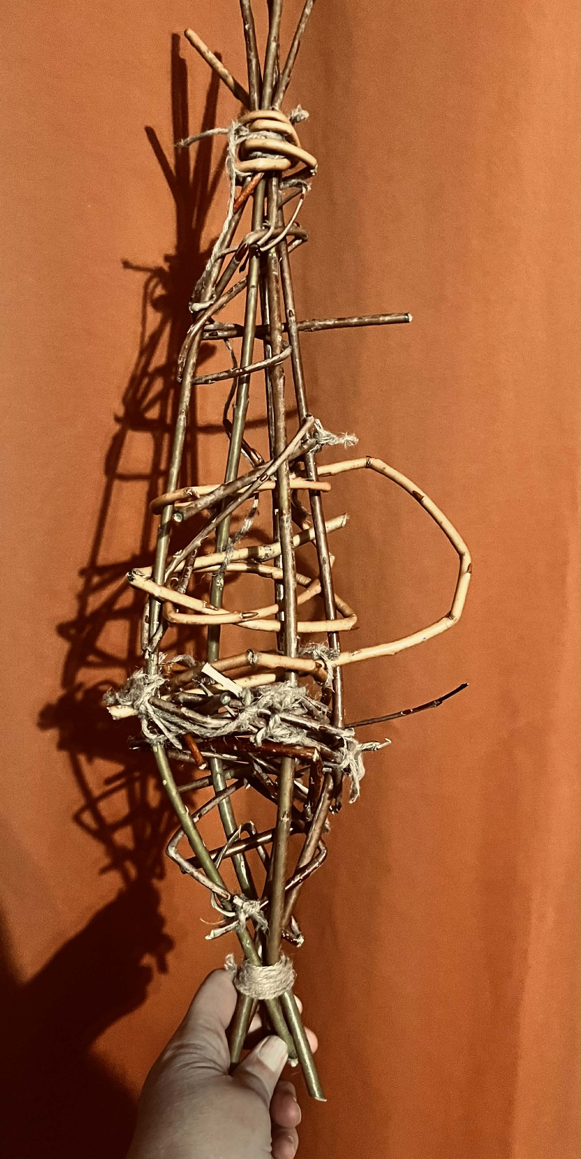 The top inside narrows into a perfect wool holder space and i decided why not and pulled and weaved the wool between the five big main willow stems.