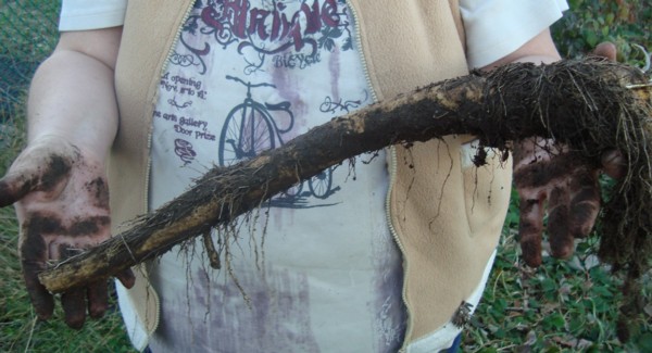 Now on to the roots.. Here is a fresh one year root out of the ground.. check out that size, its would make about 2 pints of ground horseradish.