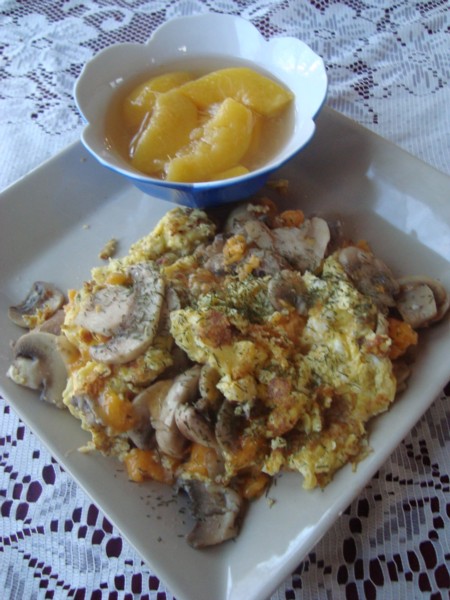 Which was a nice two egg scramble with fresh mushrooms, herbs with a little old chedder, and half a pint of my home canned locally grown peaches. This meal is a perfect example of tricking the mind.. you can see by this picture that it appears that the is tons of food on this plate.. and that is the whole point.