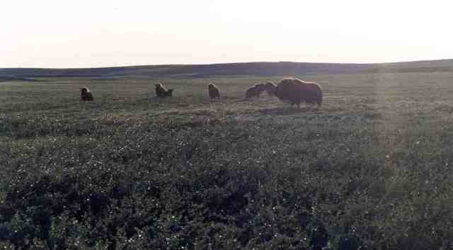 Now just in case someone thought, why didn’t he just stand up and they would all run away, well Muskox are not deer or boo that are most likely to just run away, they will stand their ground and while its not easy to see in the photo that little dark bob beside the cow is a calf, and you don’t want to mess with a herd of Muskox at any time but add in calfs and you had better mind your P & Q. It seemed like every summer someone was reported injuried or killed because they took a risk around the young bulls across the territory.