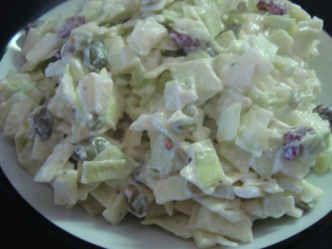 Diced 3 cups of green cabbage, 1/2 cup of pumpkin seeds, 1/2 cup of dried Cranberries, Mix the above an the dressing together, allow to chill in the fridge and for flavors to meld.