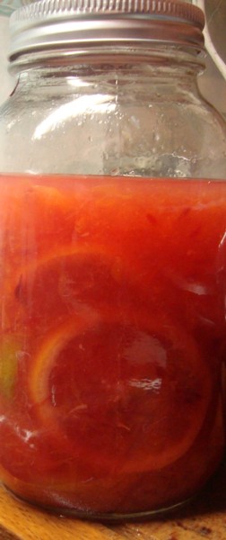 A week Later and here is the finished Citrus Vinager, what a heavonly color and amazing flavor this has got, I just put the jar in front of a window with natural light to take this photo, the vinager is quite a bit thicker then typical would be. It made a full pint jar.
