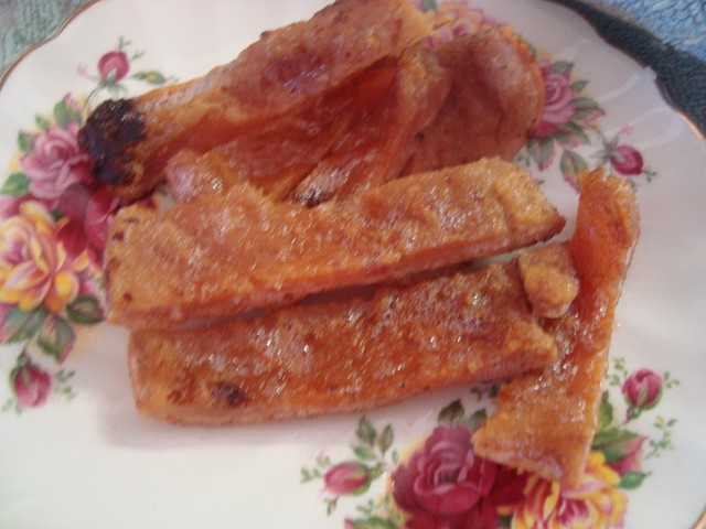 Once you it, you get it out of the pan and cut it into stripes before it has a chance to cool and get all crispy, at which point it will become very hard to cut, some folks like to cut the stripes into cubes, I like to pick up a piece and give it a chew to get peices off, but if you like it more tidy by all means feel free to cut it down in size. Its worth noting that this was clearly a pink pig, and that my black skinned pigs would give a light black rind.