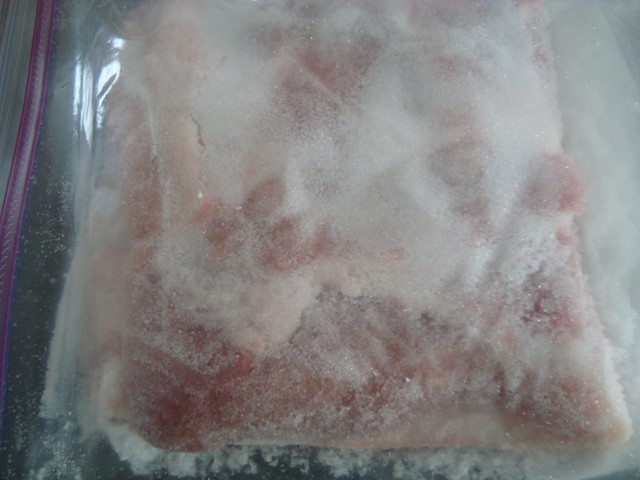 After a eight days in the brine, its ready to come out, be well rinsed and baked for my planned uses, it would also be ready to be hung to dry as two other pieces were for later use, and then I am going to smoke them.. Below, Trimmed and covered with its dry Brine..