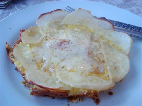 You can use either a small cast Iron Frying Pan or a glass dish, grease your pan, I used my homemade Lard, then layer your finely sliced potatos as the crust on the side and bottom. Then mix your eggs, milk, onion and one extra, pour into your potato crust and into a very hot oven at 400 and cook till the the middle comes clean with a knife, let cool for just a min or two, and then run a metal pie lifter to run around the outside and down the potato crust and either cut into portions or if using a small cast iron, just lift out and serve, which is what I did in the photo above