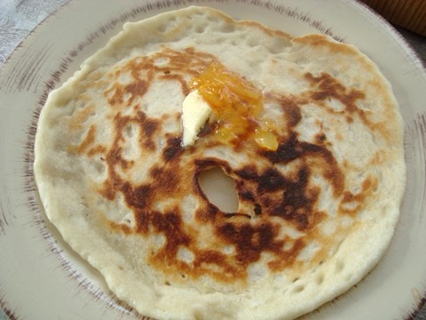 Snacks;  Morning Snack, One half egg sized fresh Bread dough stretched out thin, cooked in the Cast Iron Fry Pan, with a bit of butter and orange marmalade