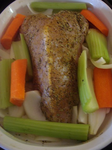 Supper: Brined Whole Chicken Breast on the bone, with herbs/spices, onion, carrot, celery with oven baked fries.
