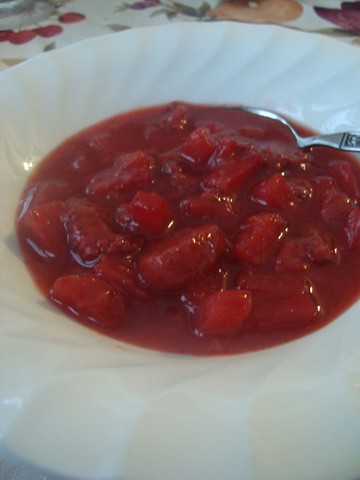 One of my fruits for my March Challange, as I am currently eating out of my house, I took some wonderful frozen strawberries from my garden and mixed it with a jar of homecanned pinnaple, with juice and cooked into a nice fruit compot.