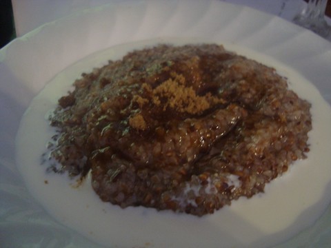 Breakfast FG-Red River Porridge, done fancy, brown sugar with sheep milk. DH’s Watermelon Cake, two big Pieces.
