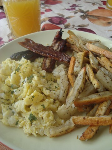 Our Fancy Sunday Breakfast, 3 slices of homemade bacon with sweet Mustard Glaze, Herbed Oven Baked Homefries, Scrambled eggs with Dried Nettle, and that glass of stunning sunshine color is homemade pinapple with juice, blended together into a fruit smoothie.