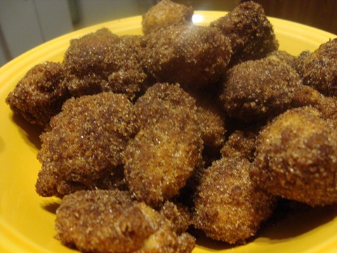 Mix till it formed a stiff dough, got out my tiny cast Iron fry pan and filled it with oil and heated at med heat till it was hot though, and dropped scant half tea-spoons of the dough into the pan, it held six to seven at a time, flipped over when golden brown, and drained on a clean cotton dish towel, processed until all done, then mixed about a tsp of Cinnamon with about a 1/4 cup of sugar and flipped all the cooked timbits in the sugar/cinnamon mixture.. Voili Sweet, crunchy fresh homemade timbits..
