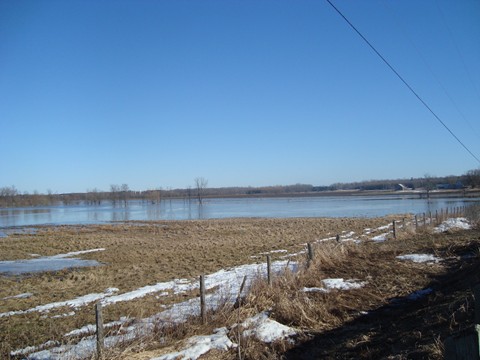 Oh, and let’s not forget that the river levels are a little high right now – which is to say, Farmgal and I could be proud owners of new beachfront property tomorrow. As is usually the case around here, spring also means that a vast stretch of farm land, roads, and lawns immediately north of us becomes submerged under temporary lakes. Observe (said the guest-blogging Dear Husband, trusting that Farmgal will come along and insert photographic evidence from this afternoon’s driving…):