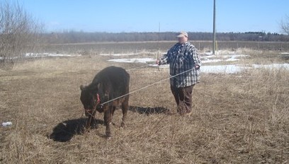 As I am on Dial up, putting in or watching video’s on others sites are not really possable, so it will be photos.. so first we did a grow out photo of Girl my combo milk cow/large draft cow to be.So she got her feet picked up, her full body brushing, her all over touching, and a number of quiet touches on her udder area.. this little ladies temperment is to die for.. she is so willing to learn and work and so calm when in her halter, an so much more hoppy and kickin when not.