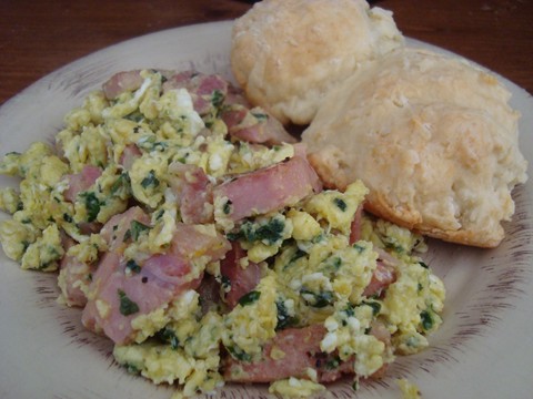 Kidding.. sort of, as a canadian, I was pleased to be making this, as a lover of all things smoked, I loved this project, I bought a whole 14 pds loin and cut it up to make four good size roasts, and then smoked with hot smoke but wet wood.. turned out heavenly, and we will be eating it for some time to come, however I got knocked down with a nasty flu and so only had got the one meal made by deadline time, which just happened to be fresh farm eggs, a mix of turkey, duck and chicken, with fresh stinging nettle and dandelion greens out of the garden, with homemade fresh baking powder biscuit, a match made in heaven to go with that sweet(cooked in maple sap water) smoky flavor.