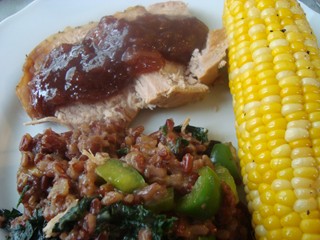 We are having Pork Roast, with Fresh Made Rhubarb Relish, Corn on the Cob, Red Rice, with Stringing Nettle, Green Peppers with Mozza Cheese Melted In.