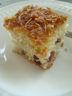 Then take brown sugar and lightly sprinkle it on top of the cake batter, till you can’t see it anymore, then take Coconut and repeat, covering the brown sugar, then Bake in a 350 oven for about 35-40 min or until a knife comes out clean.