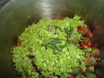 Jelly Version, Cook Rhubarb, Spruce tips and mint, strain though cheesecloth, collecting all drippings and make into Jelly instead.