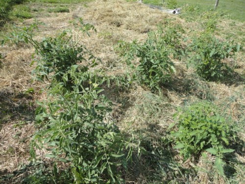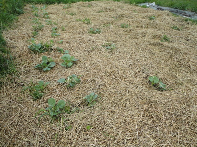 • I use straw or old hay to cover the ground between the plants, this helps retain moisture, suppress weeds and helps the plants be healthy plants, and healthy plants are less likely to be attacked then weak plants are. While they are still young now, by fall, these patch will be overflowing and the straw will not even be visable for the plant growth.