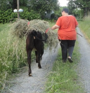Her ox training is going well, getting better with age and working.. her first load hauled was a sled full of tools, this summer she got to haul in some hay, once we got the equipment figured out, it went fairly well but I will be happy when she is full grown and DH finished making me my stone boat for moving things around.