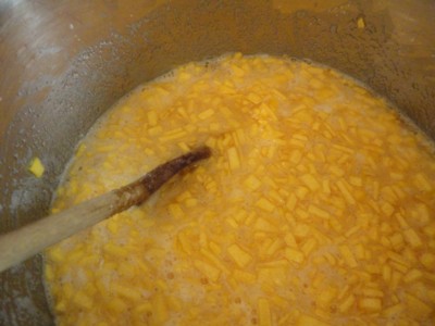 If it does not reach up and cover the pumpkin by three hours, add a touch of water as need to raise the level, bring to a boil, for at least ten min, the pumpkin bits will turn clear, as you can see on the spoon, half are done and clear and half are still to raw.