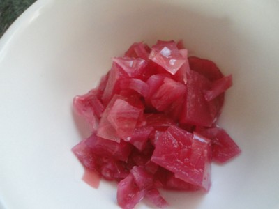 Cube your Kohlrabi into 1/2 by 1/2 cubes up to 1 inch by 1 inch depending on the size you like, cover them with water and simmer till “just!” tender, drain and add to your brine.