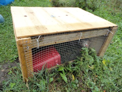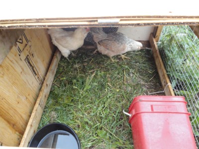 I am unhappy with the water and feed being on the ground, so as soon as I have two new smaller plastic bottles used in the house, I will wash them out, cut feed holes in them, and attach them off the heavy 2 by 4 so they don’t take ground space on the girls.. I might rethink their nest box as well and see if there is a way to hang a just big enough, but I wanted to get the girls in and working, figuring out what works best will come quickly enough. I can see moving the nest bucket each day from corner to corner will be needed so that the girls can have a go under it. The floor space is 12 square feet, I have started with four hens so 3 square feet each, compared to their normal pens, this seems like not a lot of floor space to me but given that I will be giving them fresh ground, I figure they won’t mind to much once they get used to it, I didn’t put a boy in the group because I don’t need the girls breed at this time of the year. They went in yesterday, and as you can see from the above photo, some of the greens just outside the box are at least a foot high, and already in a day the inside greens have been worked down, I will give them another day and then add some active half done compost in one corner and sprickle of scratch on the ground to keep them going at it.