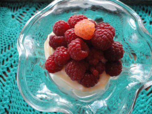 • The Tablecloth was a gift from my momma, she crocket’s and I knit, that is indeed a yellow rasberry on top, they are very firm and sweet, they have less of a acid under bite to them on the tongue then the reds do. I can’t believe we are so lucky as to still have them coming in..its wonderful!