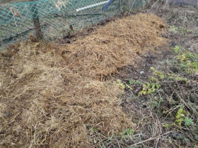 Well today was another cold wet and raining day but my apple mint is still green and going on Dec 6th!. I did get a break in the afternoon just long enough to scoot out and get some of the year old bedding with sheep/goat poo mixed in, it might not looks like much in the photo but that is six full wheelbarrol loads on that space.. giving about a 3 to 4 inch cover of mixed bedding/poo, rhubarb are very heavy feeders! While lots of area’s can stand to have some added for cover, the big one that I really wanted to get done yet was the rhubarb patch and the grape vines.. Done!