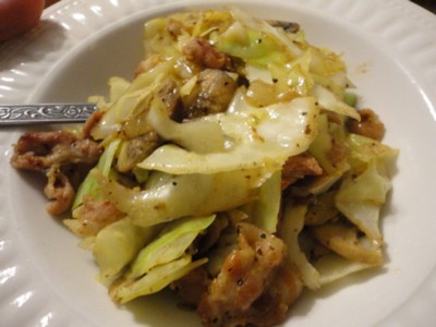 I took eight peices of bacon, diced them and put them in the cast iron frying pan to which went nexts a small onion diced and a whole box of button mushrooms sliced, I allowed the bacon to crisp a bit, the onions and mushrooms to soften, and then added a whole heaping pile of sliced green cabbage to fry up.. a little pepper added in..