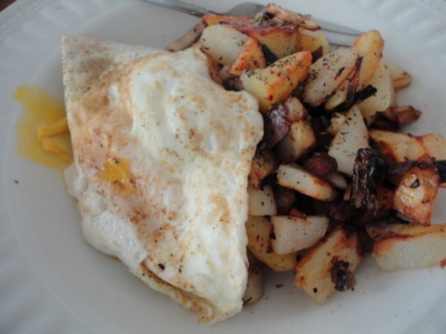 This was a dead easy meal, four med large potato’s, half an onion, two large mushrooms, and one corned duck breast, all cut into hash peices, cooked with duck fat, salt, pepper, and a fresh dippy egg.