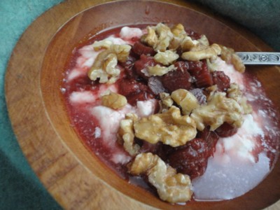So I took a liter of fresh whole still warmish sheep milk, strained it, warmed it up 110, added the warmed starter, poured out the water, dried the inner steel pot and poured it into the pot and set it for the full eight hours in the shuttle chef.. it made a very good yogurt, not as thick as my normal one, I think if you let it sit longer it would get more tangy and full body flavour.. So this morning, I had a bowl of it with canned strawberry Rhubarb fruit with walnuts.. No quite as good as my normal yogurt but certainly better or equal to store bought..