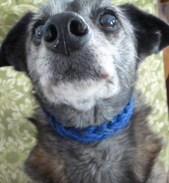 My old Girl is being kind enough to be the model to show off some of the new super soft yet amazingly strong knitted (lucet style) slip on in house dog collars. This blue one is a simple two strand of the same wool measured, cut and done into a eight cord. The typical lucet cord will give you a four stand cord, and they are very strong on their own but for the puppise, I wanted them to a little bigger, wider and stronger, so I doubled it. They have a fair amount of give to them, so they slip over the head.
