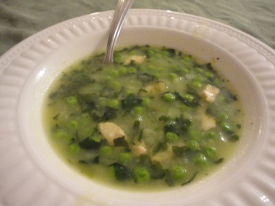 A nice spicy green soup with homegrown diced chicken breast in it.. a light fish/seafood based veggie soup