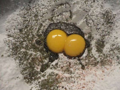 Flour, a bit of olive oil, lots of mixed dried herbs, two duck yolks and a touch of cold water..