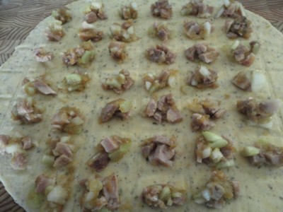 Fill them with a scant 1/2 tsp of the filling of your choice. In this case, finely diced slow roasted pork hock, minced onion and finely diced celery with a touch of my homemade green pepper pasta sauce to bind it together. Carefully lift your top over and then match your roller and roll over it once slowly and with good force.. then take your pizza cutter and finish the lines.