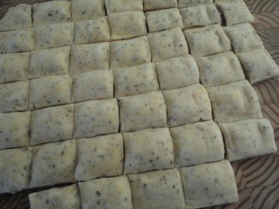 Mix, and work into a dough.. allow to rest before rolling it out.. Split the dough into two, roll your top first and you want it about 15 percent bigger then your bottom roll out, so when you split it, make one just a bit bigger for the top.. use your flour to keep it all from sticking and roll out and then lift and move over your top to rest, then roll your bottom out, and then run your ravioli pasta rolling pin over it or score it with a pizza cutter in lines.