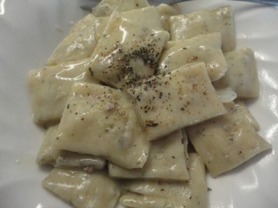Pinch the edges on each one as you lift them up and lightly flour them as you do so.. then allow to rest at least five min, just to help your seals a bit.. Heat up a big pot of salt boiling water, and slip them in one at a time, the water should not be at a roiling boil so you can’t see but it should be boiling enough that the ravioli will lift within the first 15 to 20 seconds after it hits the bottom as you don’t want them stick.. they will take about 2 min or so to cook though an float to the top, have a cast iron just warm with a touch of melted butter, as they rise, slip them out with a slotted spoon and move them over to the butter pan.