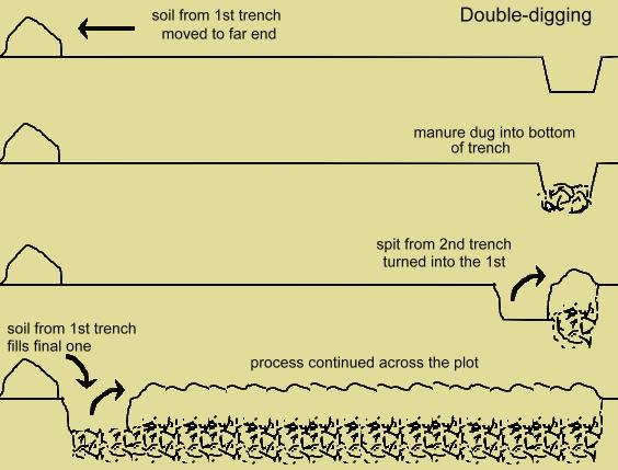 We follow the old (honestly I don’t know how old this method is but I have found it recommended for potato’s as far back as the 1800’s in books), lay down a sheet or tarp and dig out your first row of dirt, placing it on the tarp, have a a good amount of well rotted compost, sprinckle an inch or two of your compost on the trench line, then cut and flip the second row top side down into the line, repeat till the bed is done or until multiple beds are done. I don’t have a picture of this part so I snagged a drawing on it from a UK garden Site.