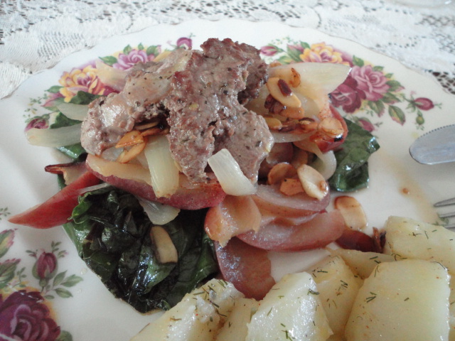 Took a big old bunch of horseradish greens, stemmed them out, and I will quick toss them in some butter and almond slivers with a touch of red wine vinager into the hot pan after I take our my lamb for stunningly awesome wilted green but you could use any greens you want to make this happen.