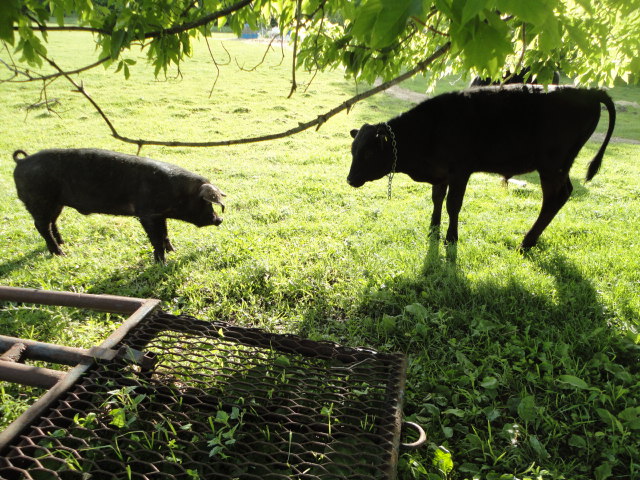 As, you can see the ducklings are growing well, they are week old and have grown at least 1/3rd in size, they are all strong legged and active little peepers.. The baby bunny rabbits are starting to nibble fresh greens and they are growing and developing their coat types, I have one I don’t like to consider for breeding and two that I will keep watching.. and below, you can see that Angelo and Marty are checking each other out, Girl and Miss Piggy figure out who was “boss” of the fields and Marty did the same with Angelo.. cows rule over the pigs, who had truly gotten themselves into a mucky dirty state when they played in the slew.. so here is my stunning Miss Piggy, looking very grubby