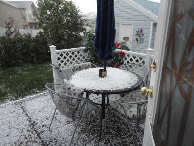 We were seeing clips on the news channel of earlier today from Alberta… At least one big mother of a tornado and rain with flooding… Guessing you were closer to the tornado??? Stupid weather!! (Glad it was “just” hail where you are; )