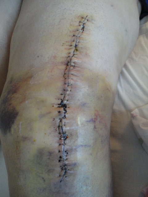 Holy hanna…that looks like a train wreck, BUT I know it is for the best. My gf had both knees done about three months ago and she is SO thrilled that she did it. We (some friends) spent a fair bit of time doing massage w/ lavender oil to both break down scar tissue and reduce scarring externally.