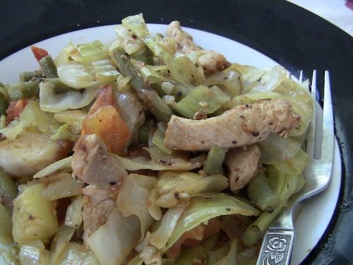 Here is our lunch today, I thawed and sliced into stirfry stripes a nice free range rooster breast, and then sliced up from the garden, four roma tomatos, two handfuls of green beans, a med size zucchini and from the store, a fourth of a cabbage head, salt, and pepper to taste, I started the meat off in some coconut oil till no more pink and then added the veggies, typically I would have added in onion and garlic but I am off those for the moment.. Makes its own sauce.. and its so yummy, don’t you just love summer meals from the garden? What did you have for lunch today?
