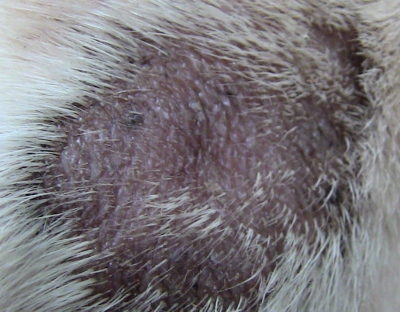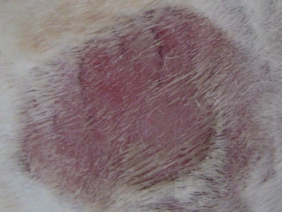 • if it looks like the last one, and it on pressure points like elbows, it can be hairless, kind of like a doggy callus, like we get on our hands or feet. If it was a red, raw infamed hot spot and they didn’t notice or say anything that would be very odd.