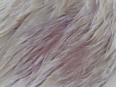 She is on a homemade diet for this very reason as well as on a allergy med.. but a number of weeks back, she was able to “break in and sneak a large amount cat food” and boy did we get the mother of all hot spots..  * compared to how bad it can be, it is not that bad but it was a good solid 3 inch by 3 inch effected spot and that is big enough as far as I am considered.