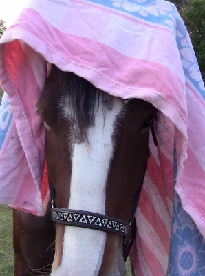 the tarp is all flappy and crinckly, which can be spooky, I had her smell it, and then because she was good with it, then I rubbed her with it all over, still good, then I gently flapped it at her, then I started throwing it over her until you got to the picture point..