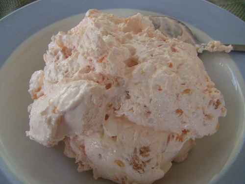 1 tub of cool whip, 1 tub of cottage cheese, 1 large drained can of christmas orange pieces, 1 orange jello mix (the sugar kind, not the fake sugar kind) mix them all into a bowl and let it sit for at least four to six hours or overnight.. eat as a side salad or as a dessert or as a stand alone treat or as a breakfast dish.. If you want switch out the same amount of cups of whipped cream for the same amount of cool whip but it won’t hold as long before weeping if you do so.