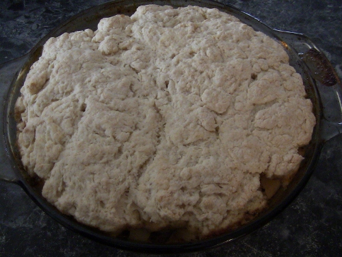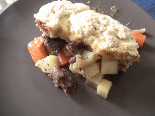 At this point, make a single batch of Baking Powder Bisquits aka Bannock.. if you are not eating glutten, then could be topped with a layer of whipped mashed with top.. or you could do a nice light layer of puff pastry.. If you are using the Bannock, then roll out or flatten down to about a two inch start and lay over the top, leaving a edge around the outside the baking dish, place the whole stew back into the oven and bake until golden brown and a toothpick comes out clean in the middle