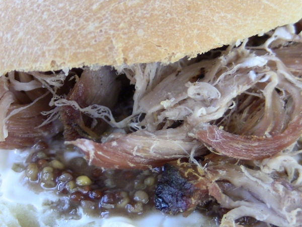 Slow roasted leg of suckling pig done in coals (don’t believe the books, it does not require an as much roasting time as they said, it was clearly overdone but still moist and tasty with a nice smoke flavor, served up on fresh warm buns from the oven with fireweed mustard (same recipe as Dandilion mustard recipe but replace the Dandilion flowers with fireweed flowers) the next batch will be with mustard, fried onion, black olive bits and some mozza cheese melted in.. It should be heavenly..