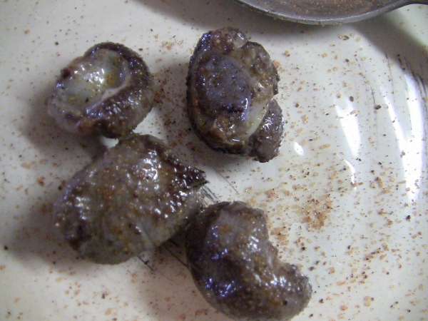 These quick cooked, seasoned little delights are the piggy version of prairie oysters. I did take a fair amount of the skin off but could have done a bit more, it didn’t bother the dish any because it was a prepare, cook and eat right now.